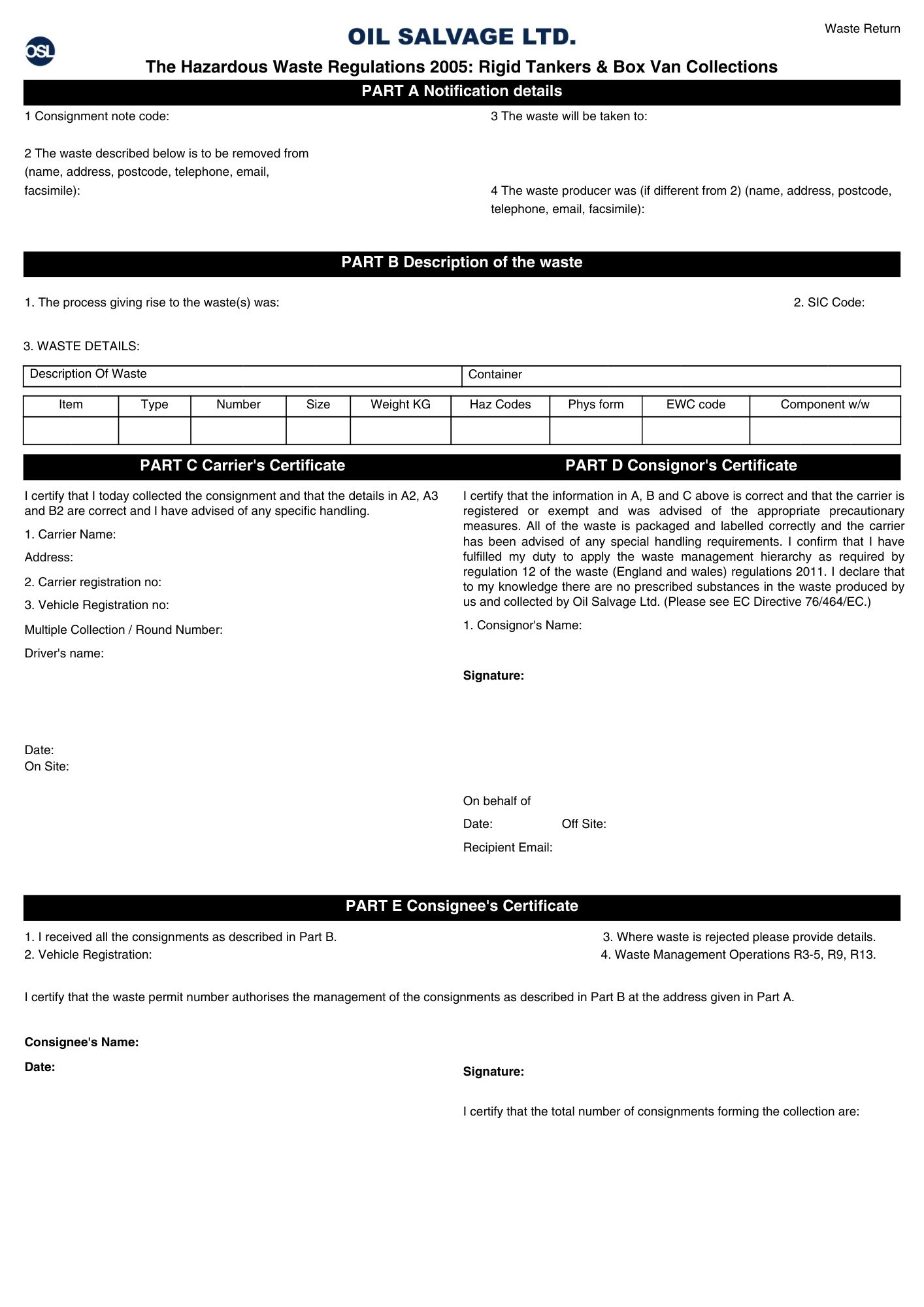 Here at Oil Salvage, we provide the full consignment note at no extra charge with every collection, so you can relax and know that your waste is collected and treated in a fully compliant manner, and you have all the relevant paperwork to back it up.